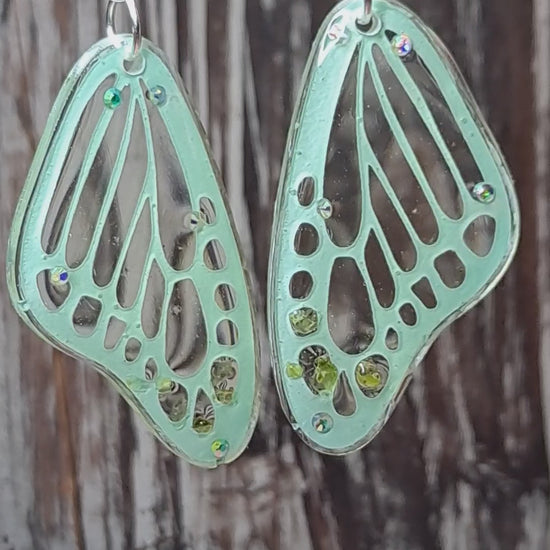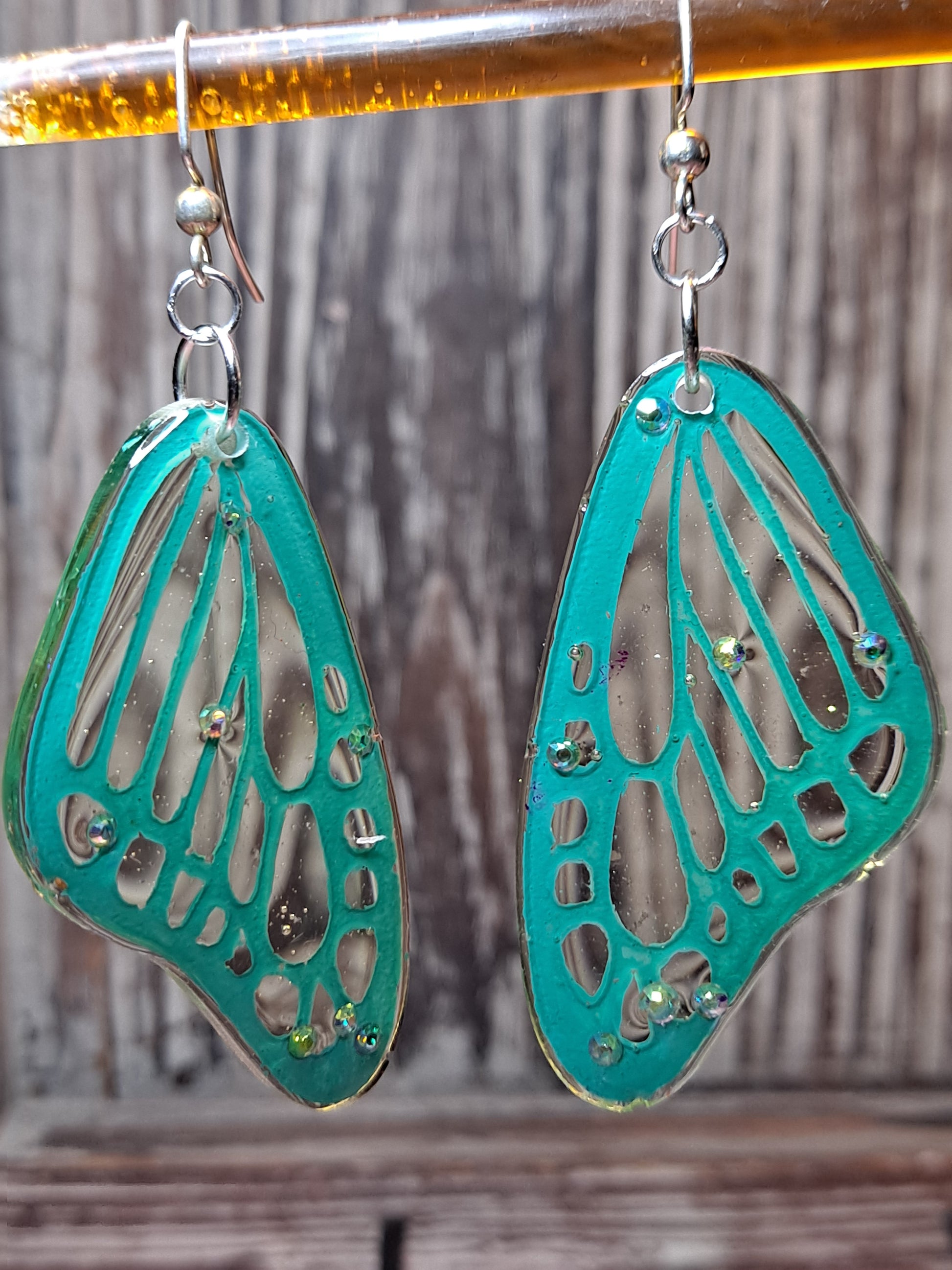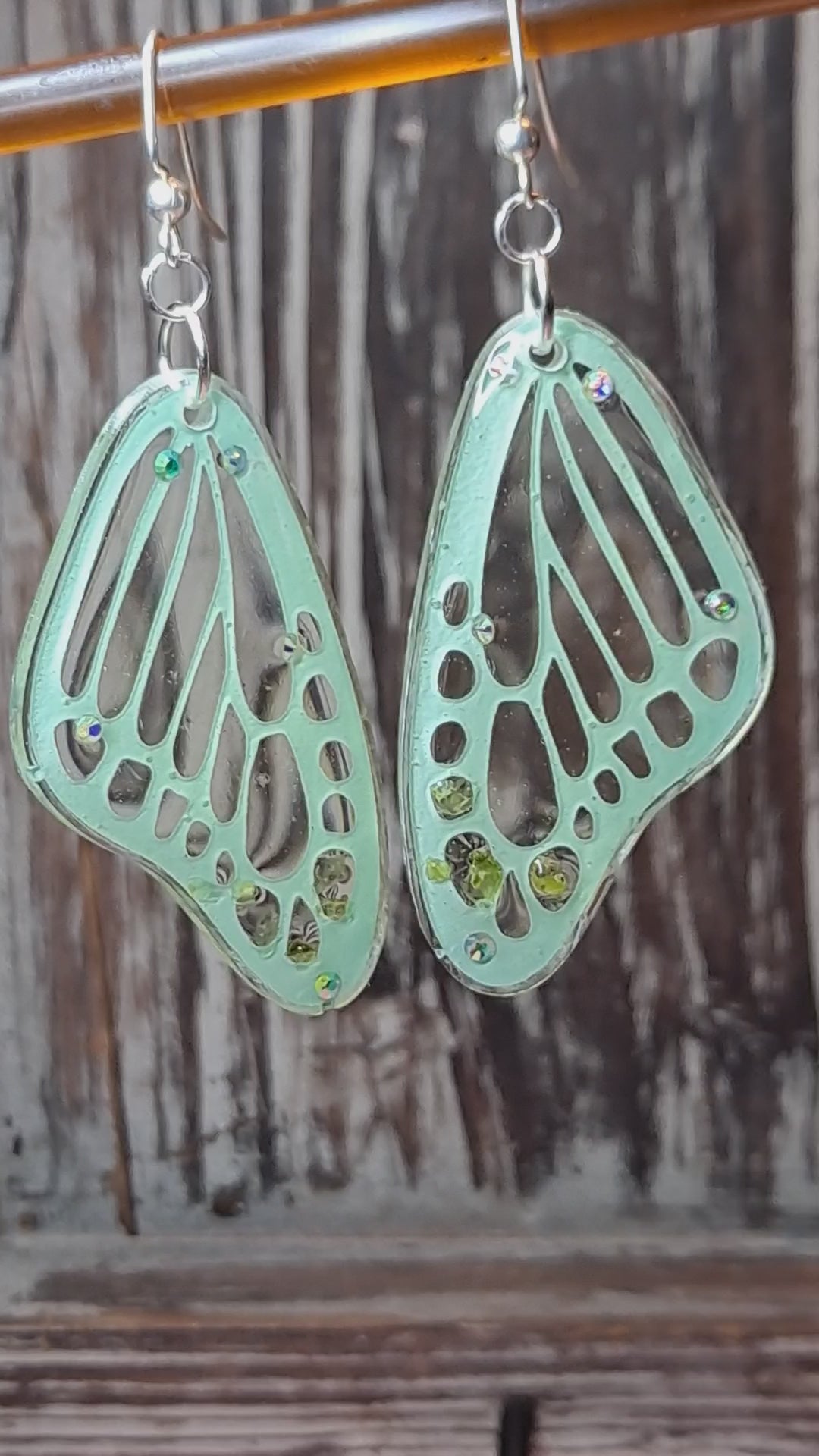 Each measures approximately 3" from the top of the hook, to the bottom of the wing. They are finished with silver hooks. The hooks can be substituted for lever-back hoops. Just make a note at checkout!