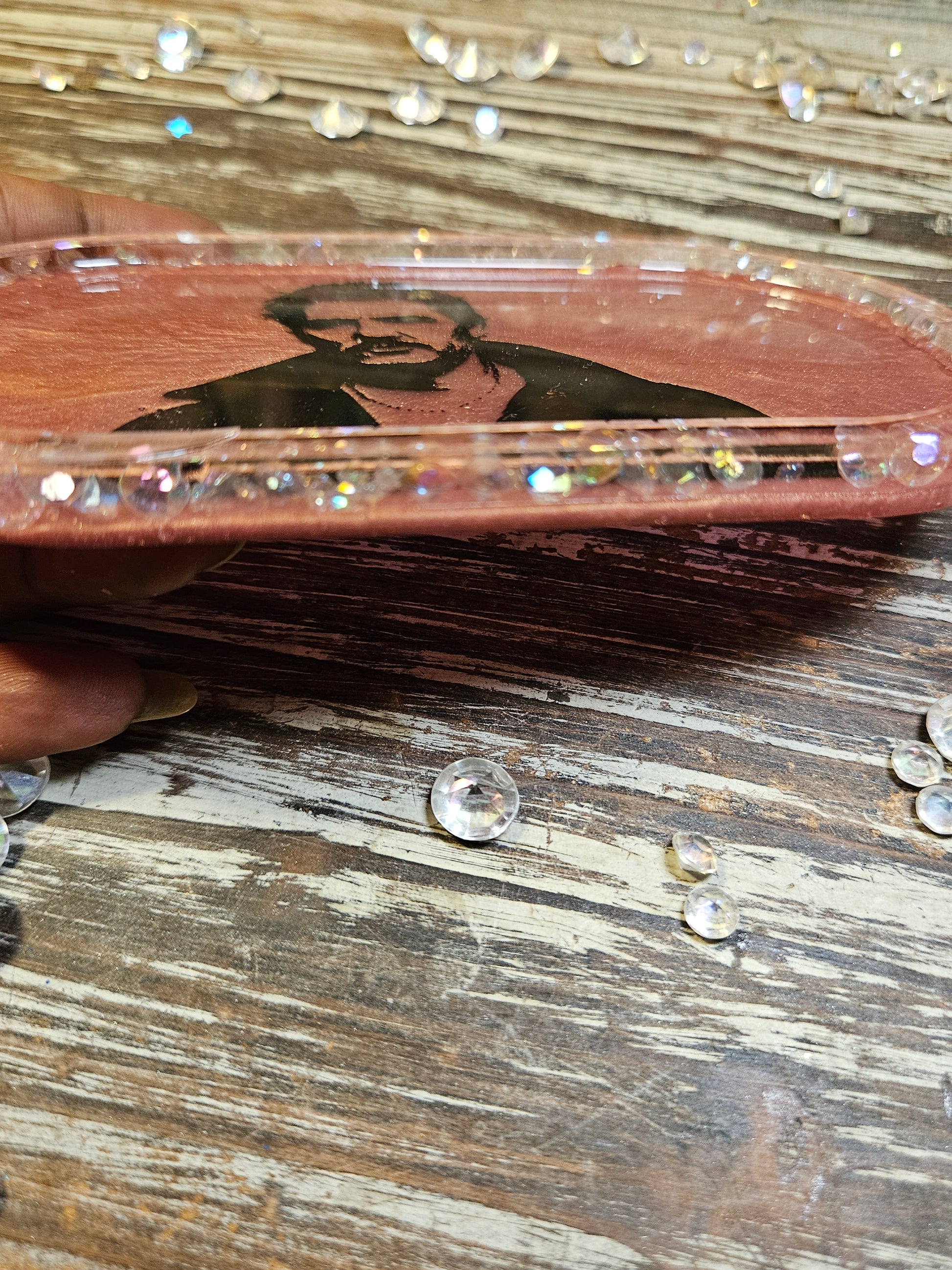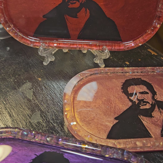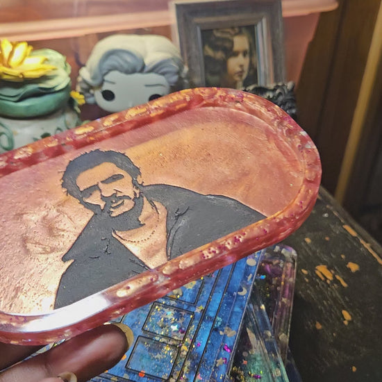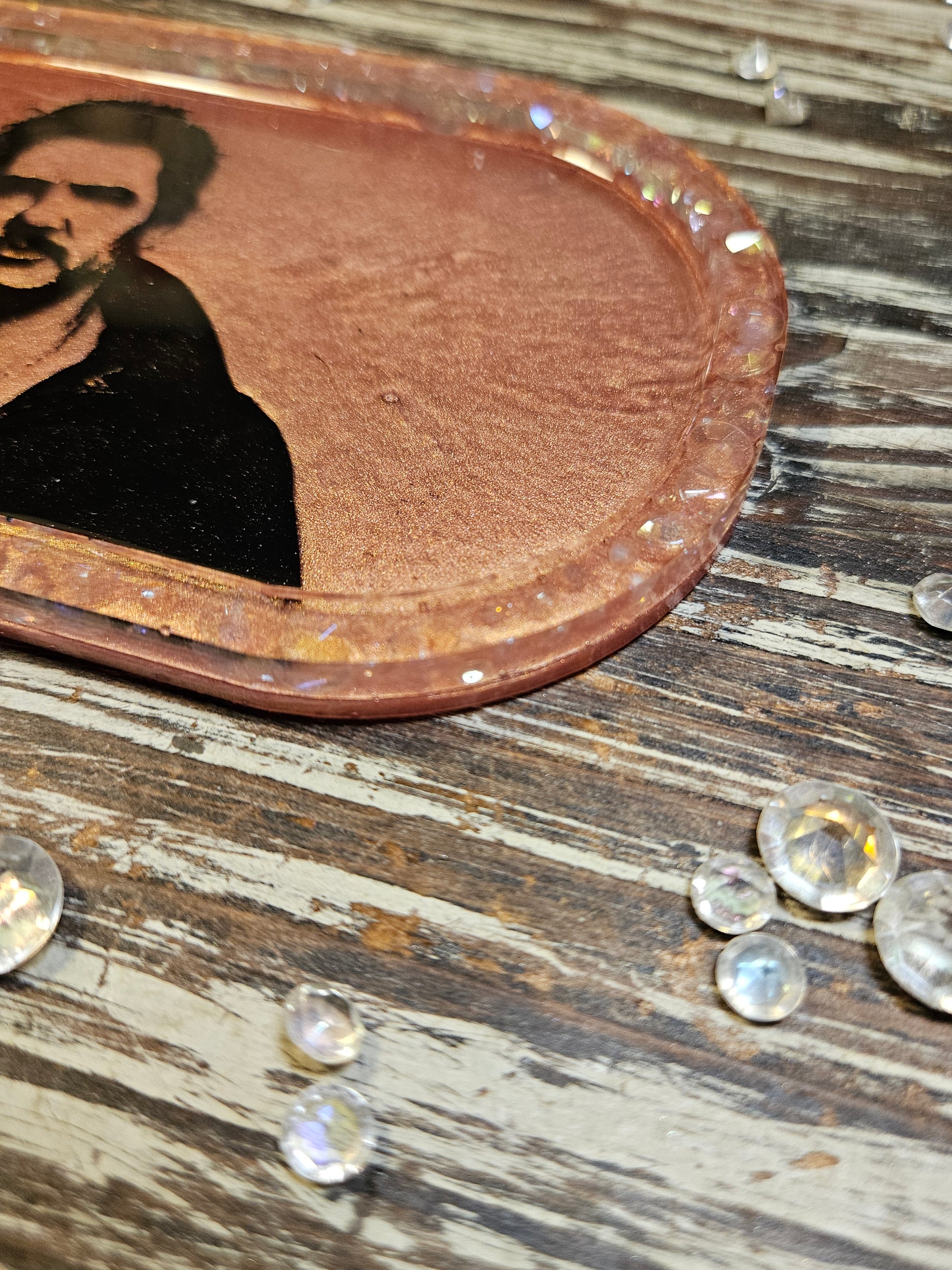 This little tray comes in pearl pink, is made of resin, & features a silhouette of my favorite man. The rim red style with clear, iridescent faux gems. Both sides are sealed for shine & durability.