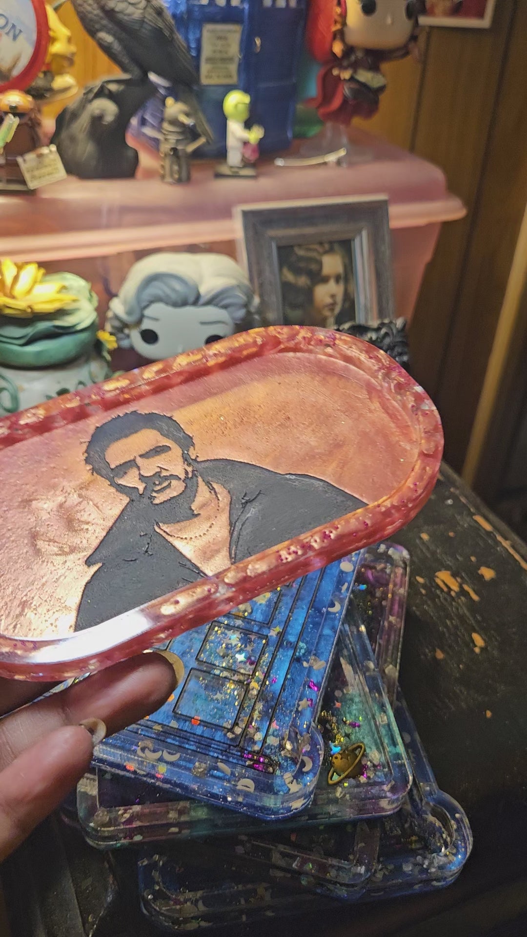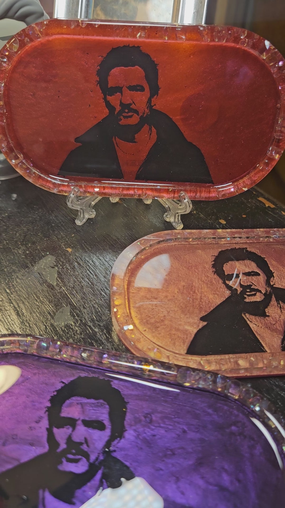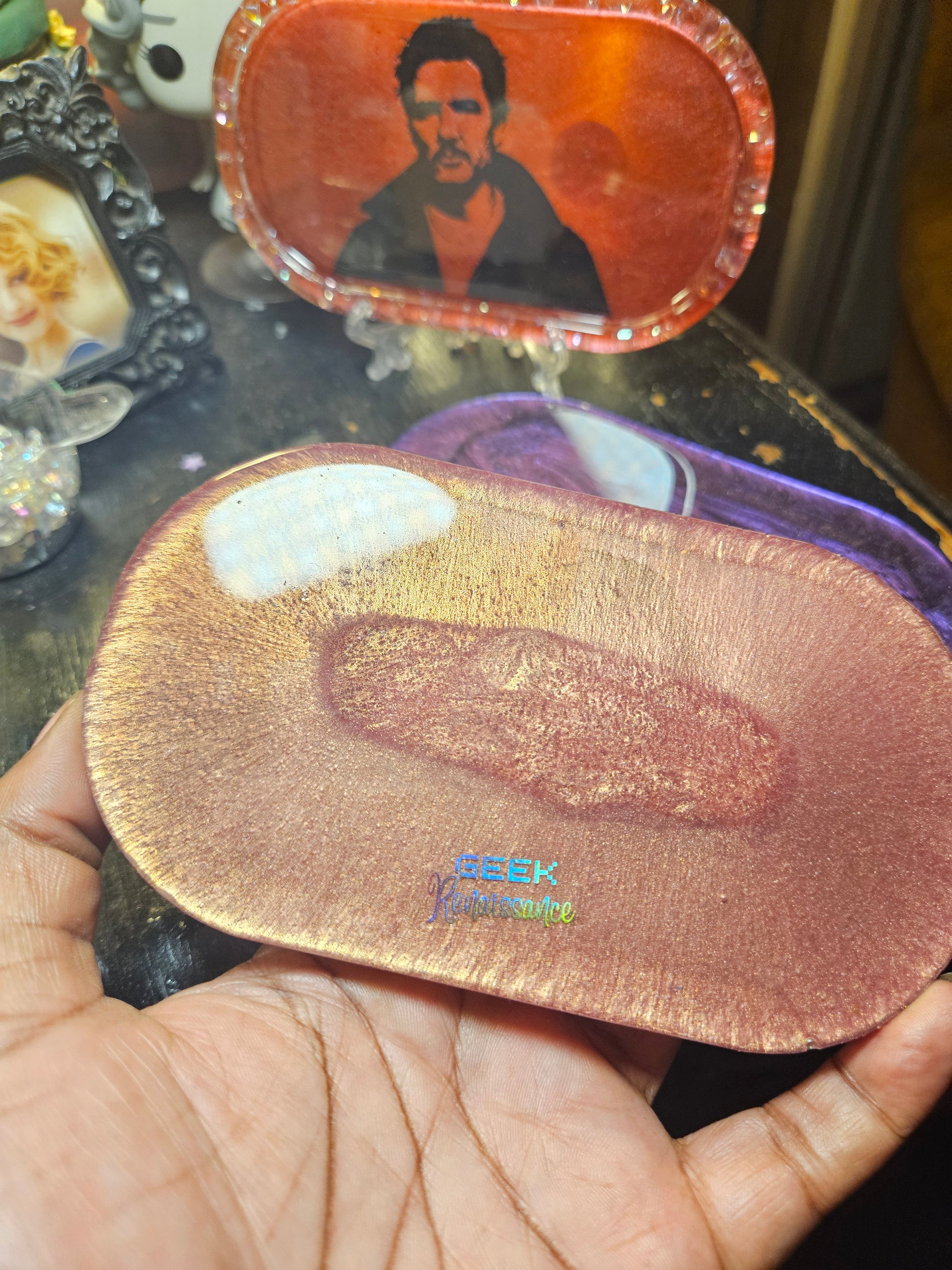 This little tray comes in pearl pink, is made of resin, & features a silhouette of my favorite man. The rim red style with clear, iridescent faux gems. Both sides are sealed for shine & durability.