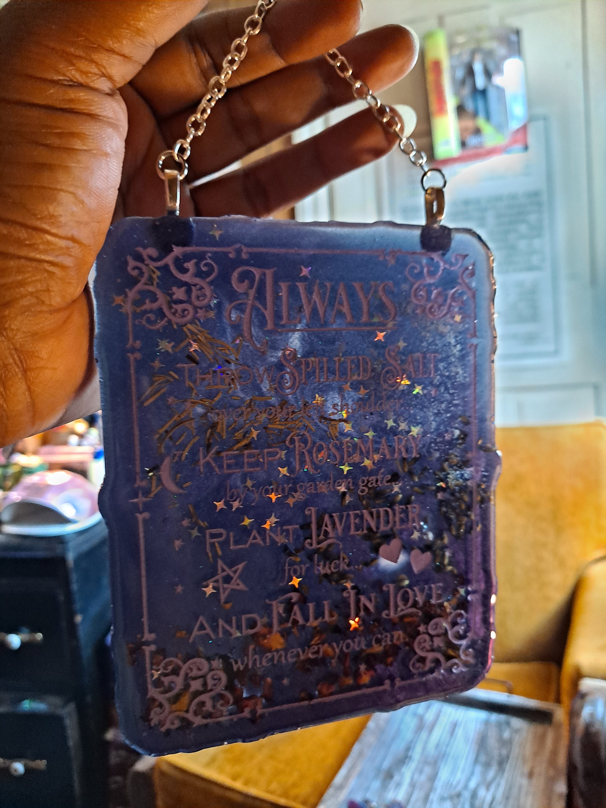 The classic quote from the magical movie is hand-painted on the sign. It is made of 4 layers of resin, custom tinted & filled with real herbs & crystals for that magic touch.